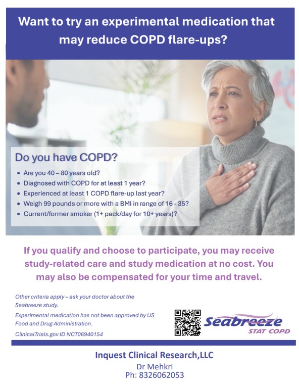 Inquest Clinical Research is currently conducting ongoing clinical studies for asthma and COPD to evaluate investigational medications that may help reduce asthma attacks and COPD flare-ups. These studies are designed for eligible adults who have been diagnosed with asthma or COPD and have experienced recent symptoms or flare-ups despite ongoing treatment. Qualified participants may receive study-related care and investigational medication at no cost, and may also be compensated for their time and travel. All studies follow strict clinical guidelines, and participation is completely voluntary. Inquest Clinical Research is committed to advancing respiratory care while ensuring patient safety, comfort, and informed participation throughout the research process.